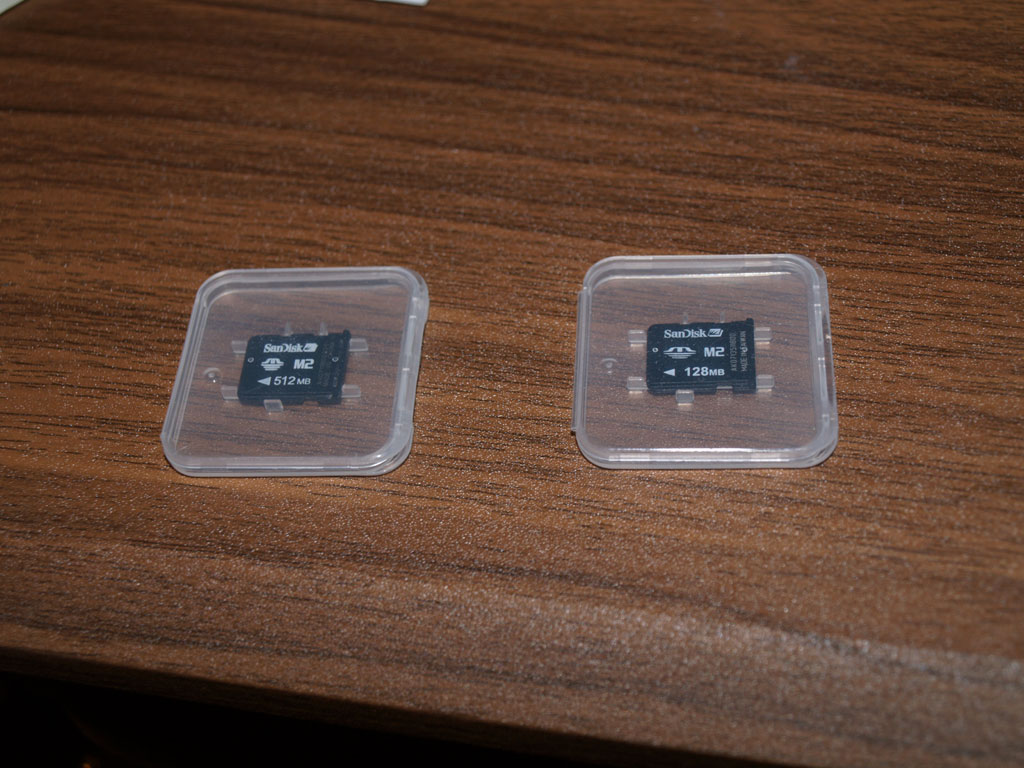 M2 atmiņas kartes (telefoniem), 0.50 un 2 Ls.Atradu vecās atmiņas kartes, kas nāca līdzi Sony Ericsson telefoniem un ātri vien tika nomainītas pret ietilpīgākām. 50 satīmi par 128 MiB, 2 Ls par 512. Satikšanās Rīgā, centra rajonā, darba dienās (jebkas cits pēc vienošanās).